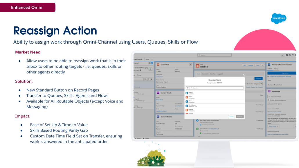 The new Reassign Action simplifies the setup process and accelerates time-to-value for Omni-Channel. It enables direct routing to skills and ensures that reassigned work is prioritised based on its original creation date. This means that reassigned tasks don’t get lost at the bottom of the queue, helping to boost resolution times and improve SLA attainment. The other benefit is that reps can also push work into Omni-Channel, if it was not routed by Omni-Channel initially. This feature is available on Enhanced Omni-Channel and all routable objects except Messaging Sessions and Voice Calls as they have their own transfer experience today.